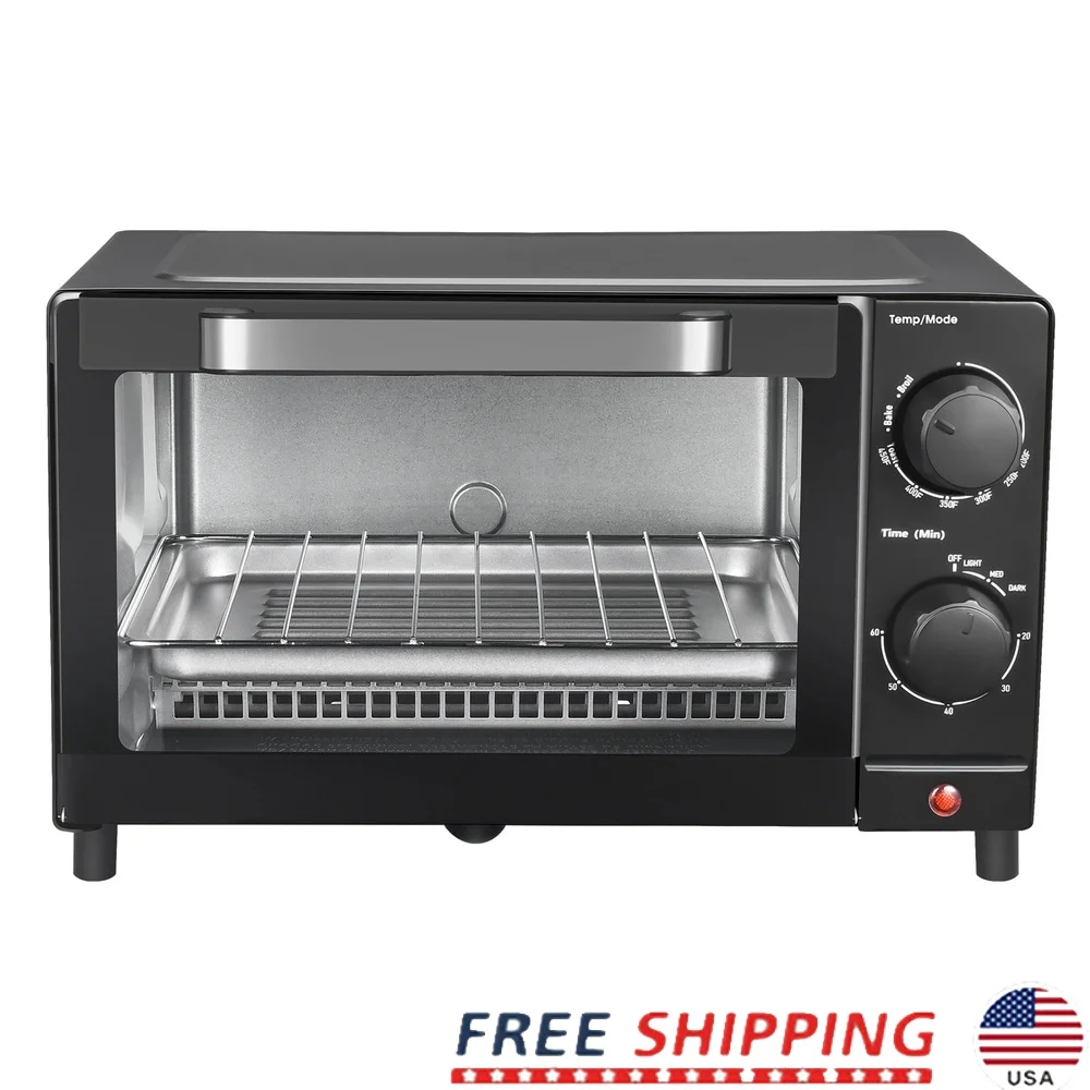 It can accommodate up to four slices of bread or a 9-inch pizza, making it ideal for quick meals and snacks. The easy-to-use turn dial lets you adjust the temperature, mode, and time settings to suit your needs. Its space-saving size uses less energy and fits neatly on most countertops. A sleek black finish blends well with any kitchen décor. It comes with a baking rack and baking pan, and the exterior wipes clean easily for hassle-free maintenance.
